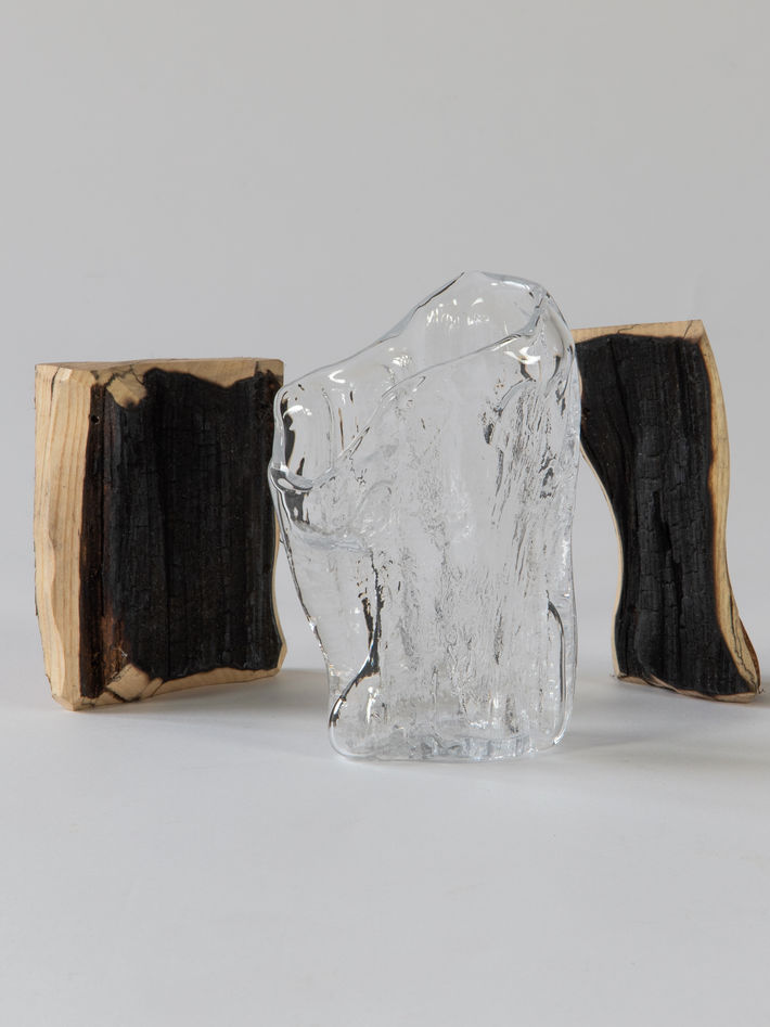 These glass vessels were formed by voids in the ash tree, which were first created by birds, bugs and the fungus that infected the tree (Hymenoscyphus fraxineus - ash dieback). Each glass vessel is accompanied by the section of the tree from which it was created, now burned black on one side by the glass blowing process.